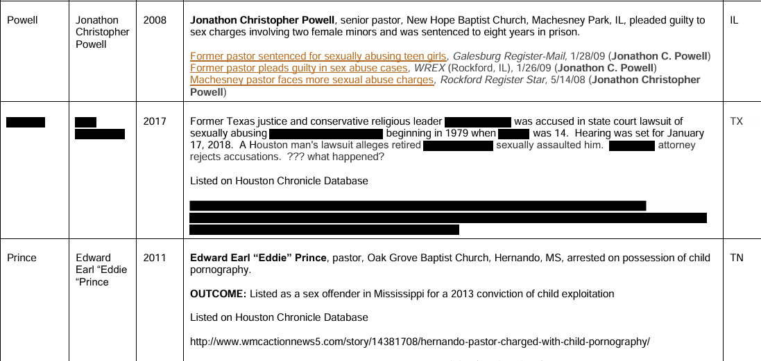 Almost four years have passed since then – sufficient time for further research – but where’s the follow-through? The image below may look like it’s something from the Epstein Files, but it’s actually from the SBC Executive Committee’s list of credibly accused clergy sex abusers.