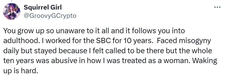 “I am a life destroyed… You grow up so unaware to it all and it follows you into adulthood. I worked for the SBC for 10 years. Faced misogyny daily… The whole 10 years was abusive in how I was treated as a woman. Waking up is hard.”